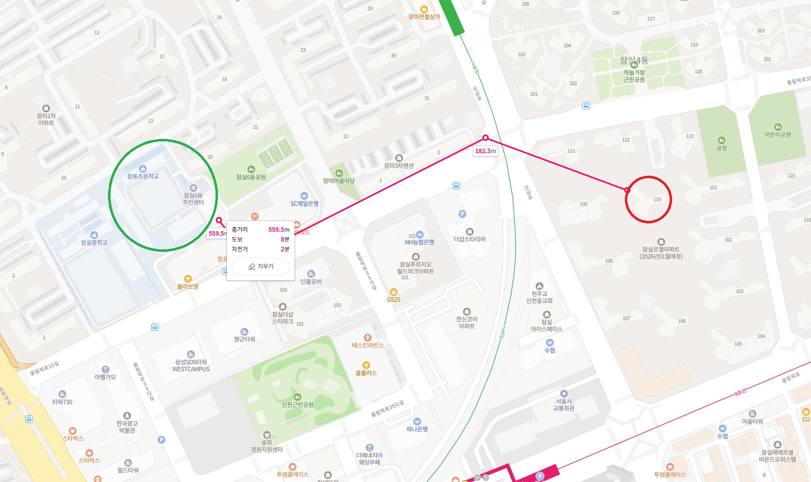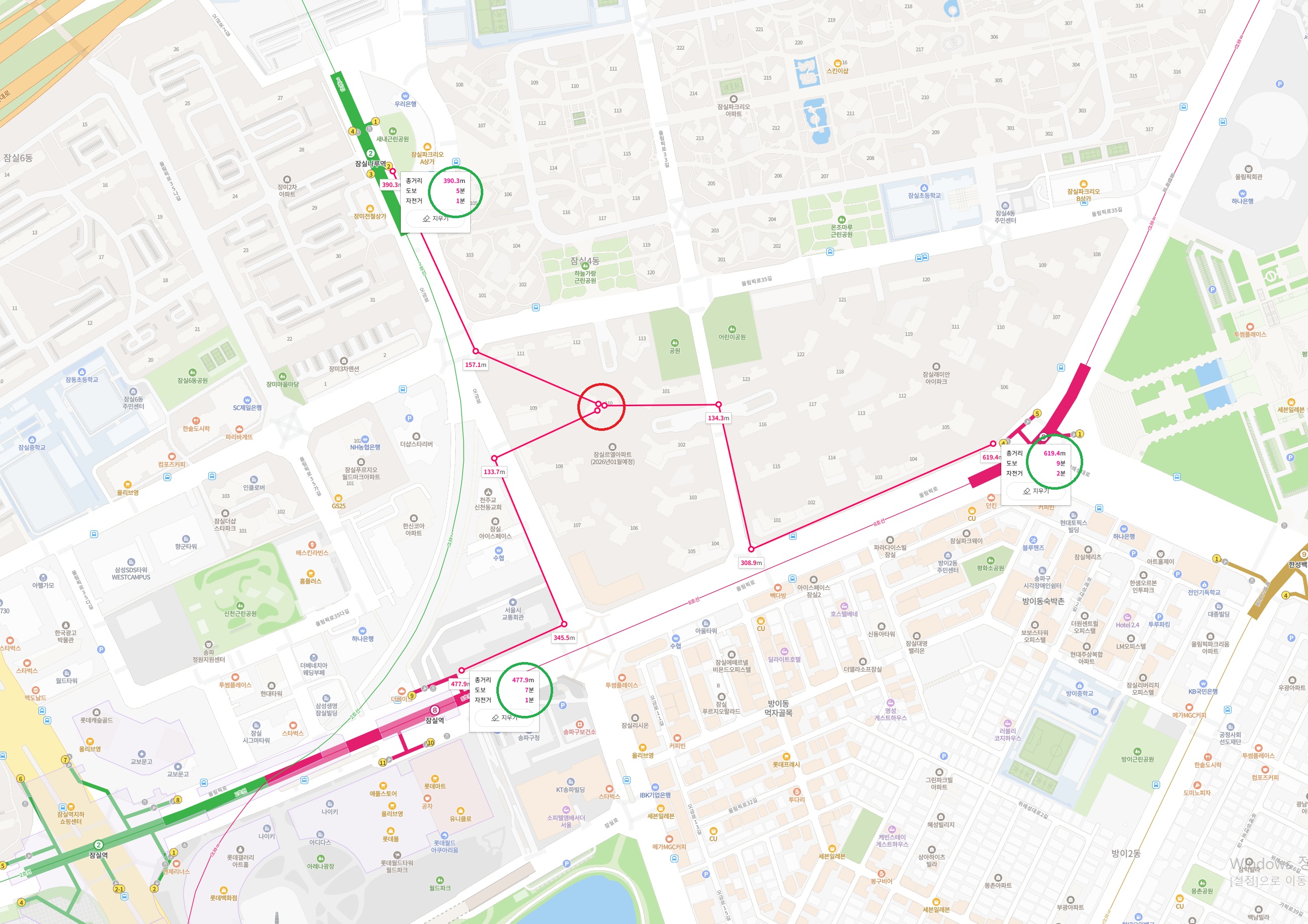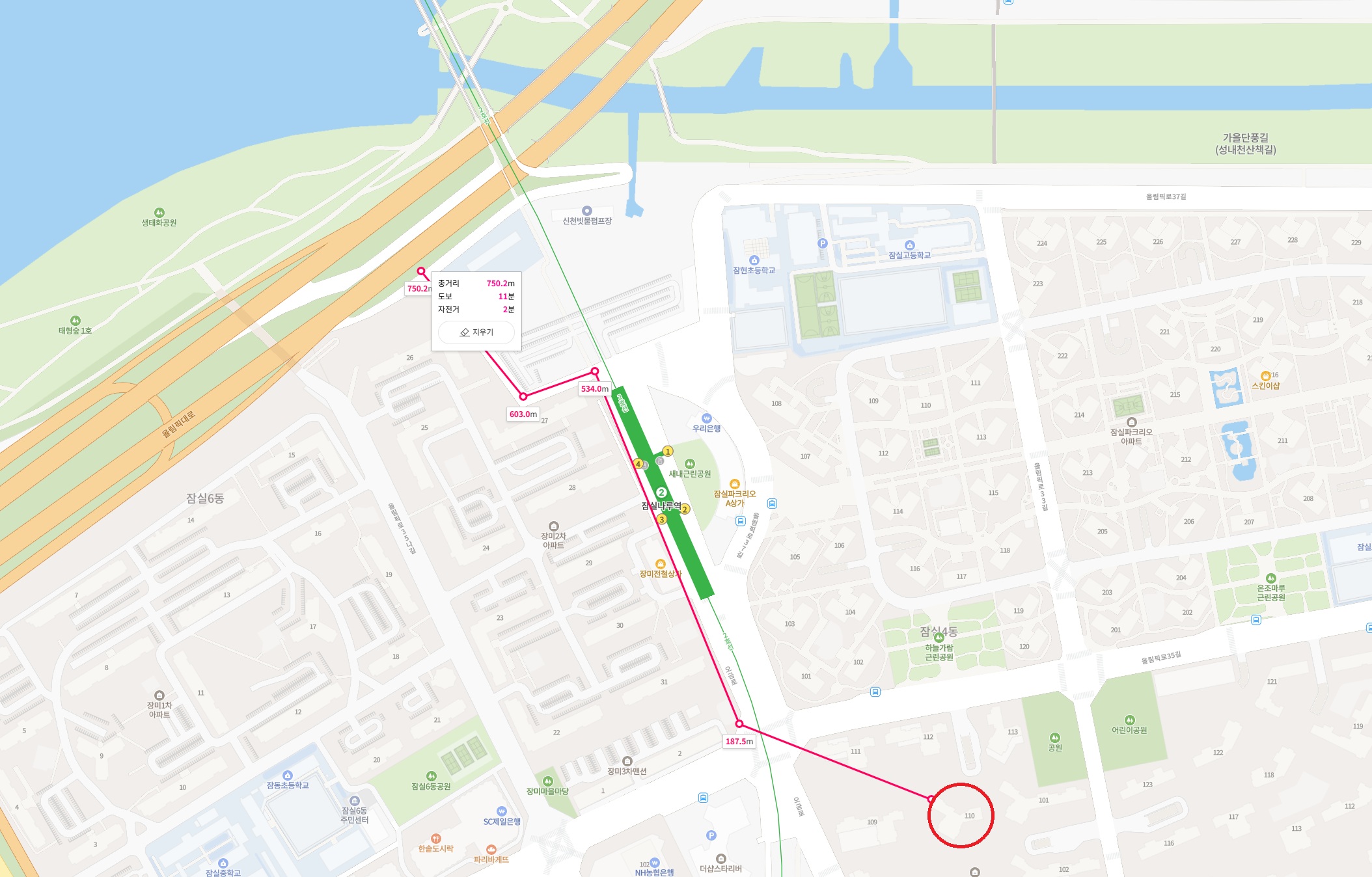 110동에서 거리로만 봤을때는 몽촌토성역이 유리하겠지만, 목적지에 따라서 몽촌토성역이 유리할 수 있어요.
