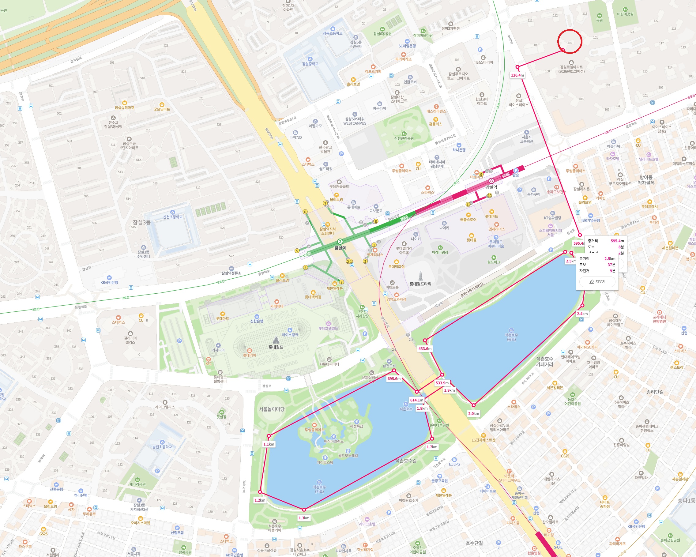 110동에서는 580m만 가면 도착할 수 있고, 이곳에서 석촌호수를 한바뀌 돌면 2.5km 정도로 석촌호수 왕복거리 포함 3.5km정도면 하루 운동양으로는 딱 좋죠~