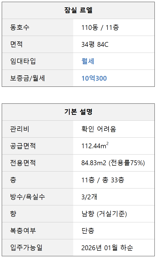 잠실르엘 110동 34평 84C 월세 10억300 물건설명 2025. 11. 29.