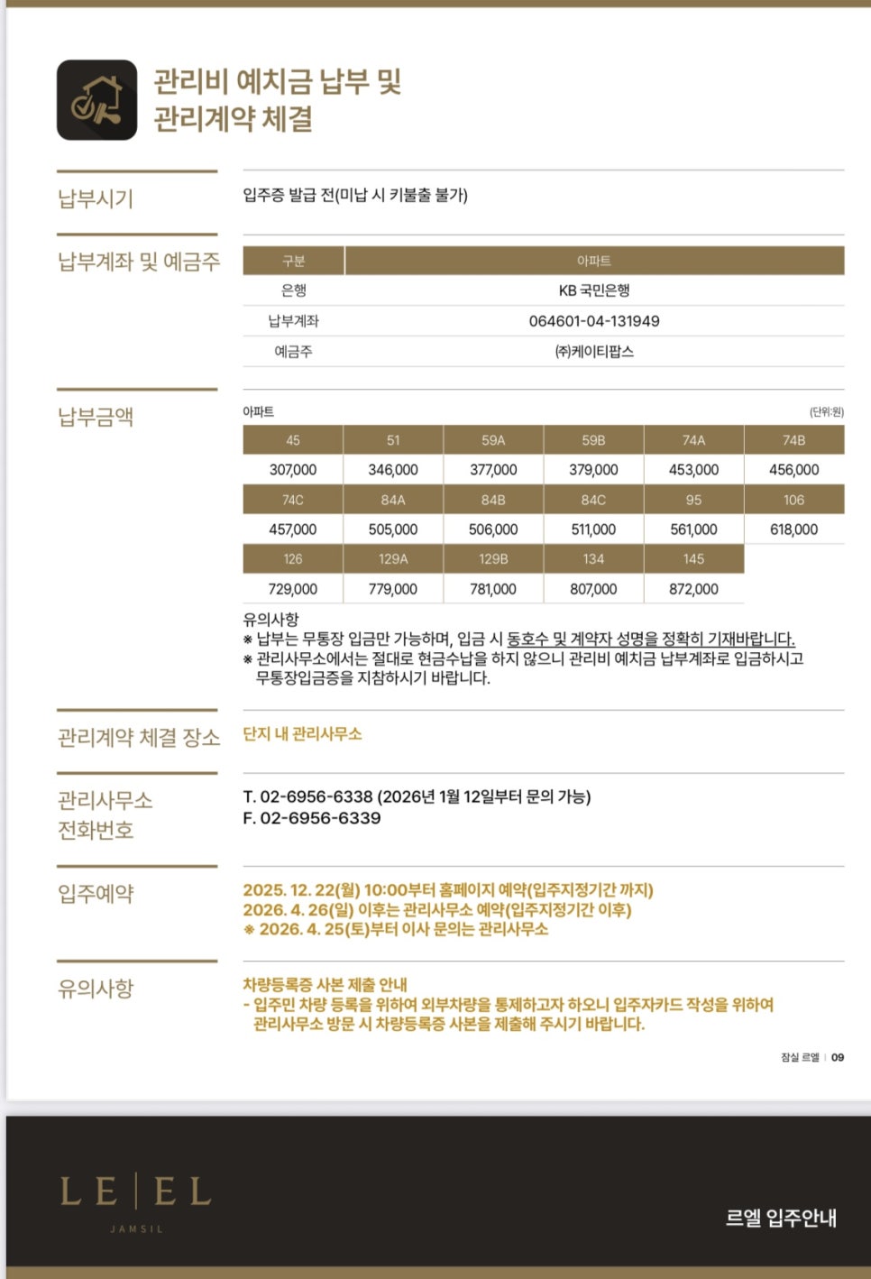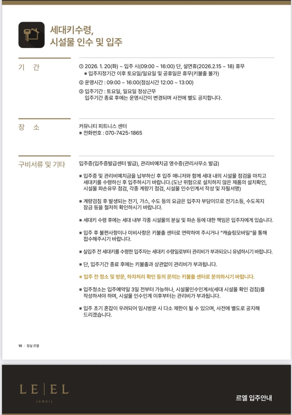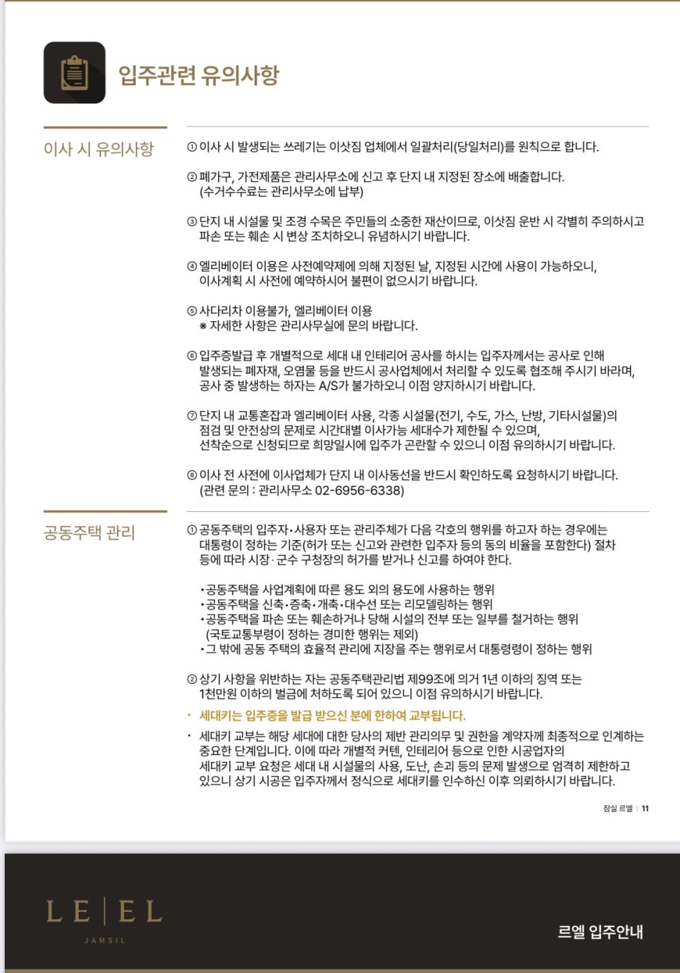 - 입주지정기간 종료 후 부터 입주여부와 상관없이 관리비를 비롯하여 전기, 수도, 가스 등의 공과금 납부