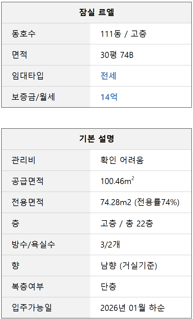 잠실르엘 111동 30평 74B 전세 14억 물건설명