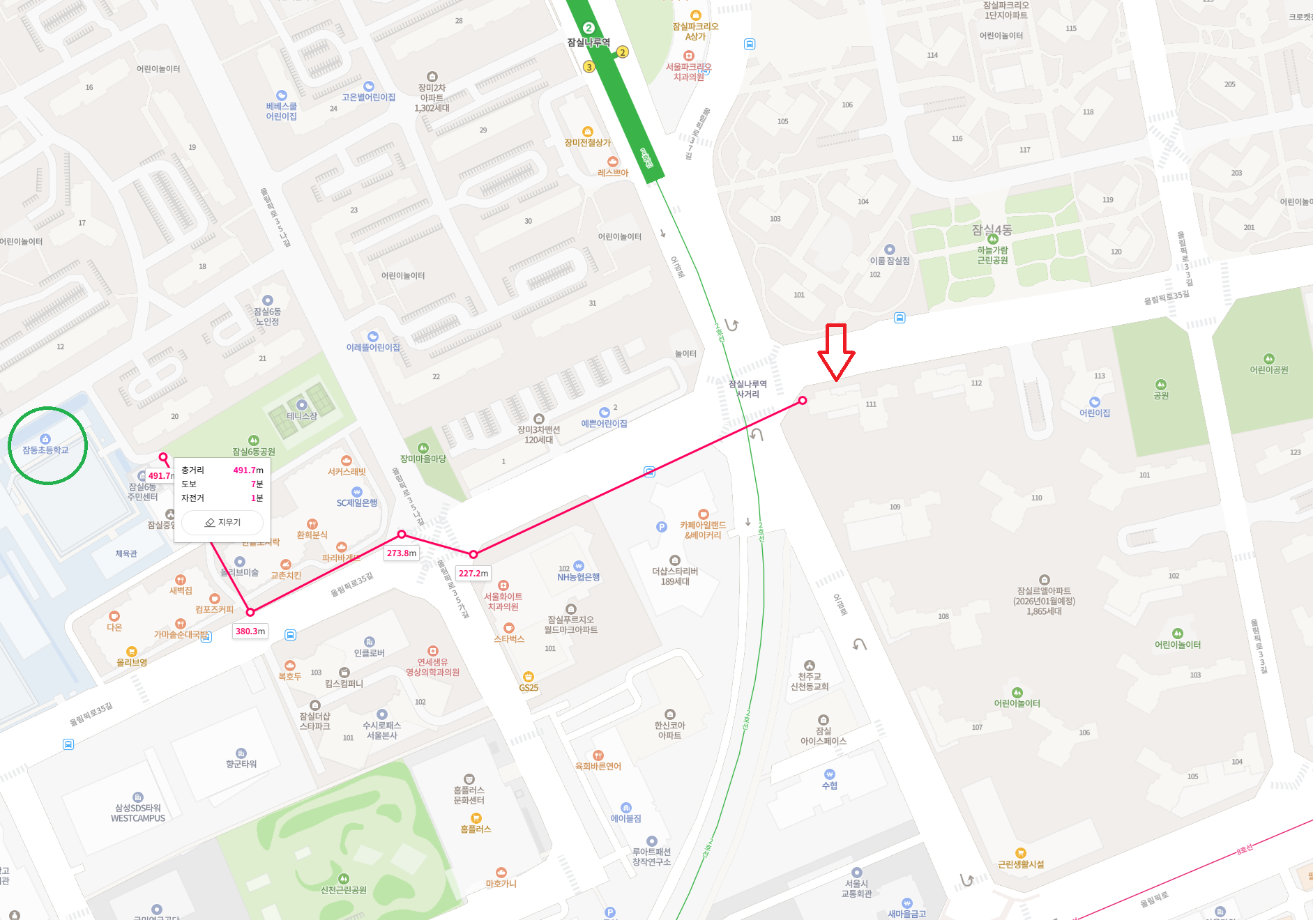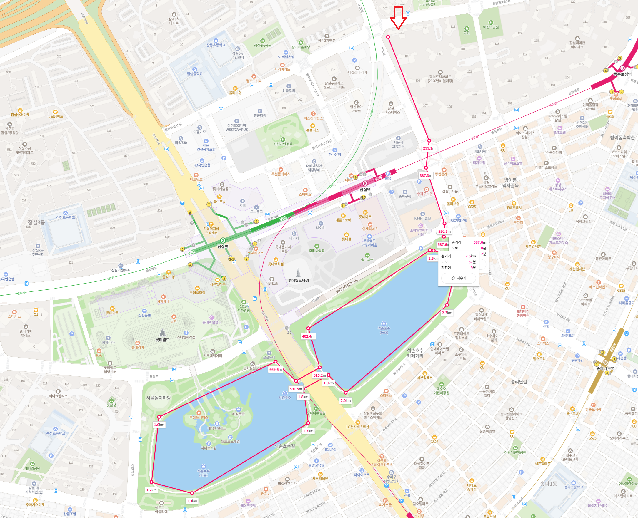 111동에서는 580m만 가면 도착할 수 있고, 이곳에서 석촌호수를 한바뀌 돌면 2.5km 정도로 석촌호수 왕복거리 포함 3.5km정도면 하루 운동양으로는 딱 좋죠~