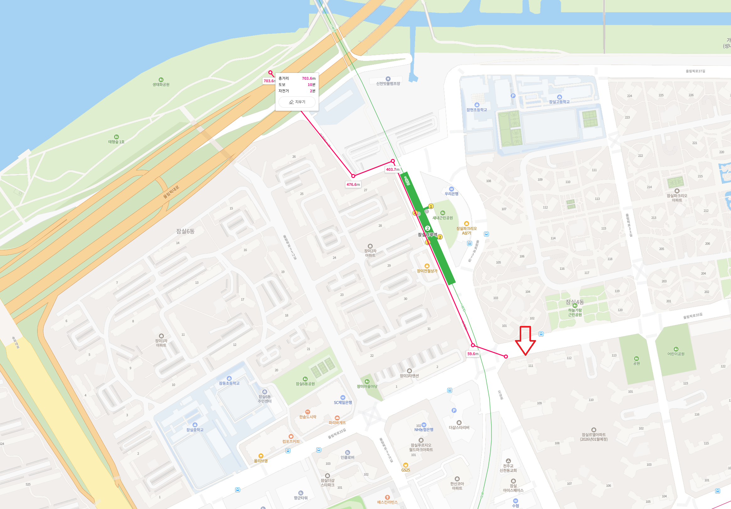 거리는 잠실나루역의 2배정도 소요되나 8호선 탑승을 하셔야 하는 경우 2번 루트가 최우선 루트가 될 수 있어요.
