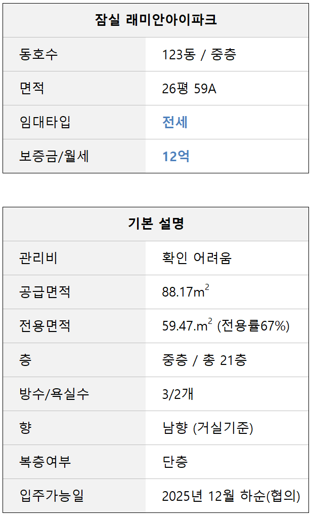 잠래아 123동 26평 59A 전세 12억 물건설명