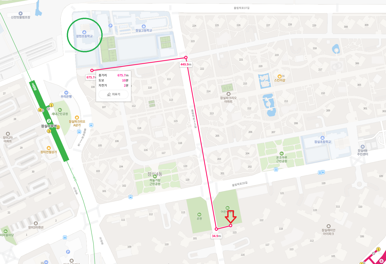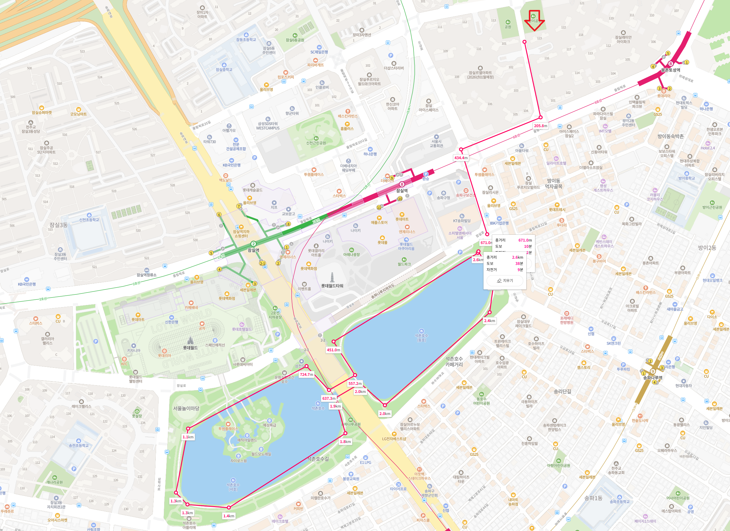 123동에서는 650m만 가면 도착할 수 있고, 이곳에서 석촌호수를 한바뀌 돌면 2.5km 정도로 석촌호수 왕복거리 포함 3.5km정도면 하루 운동양으로는 딱 좋죠~