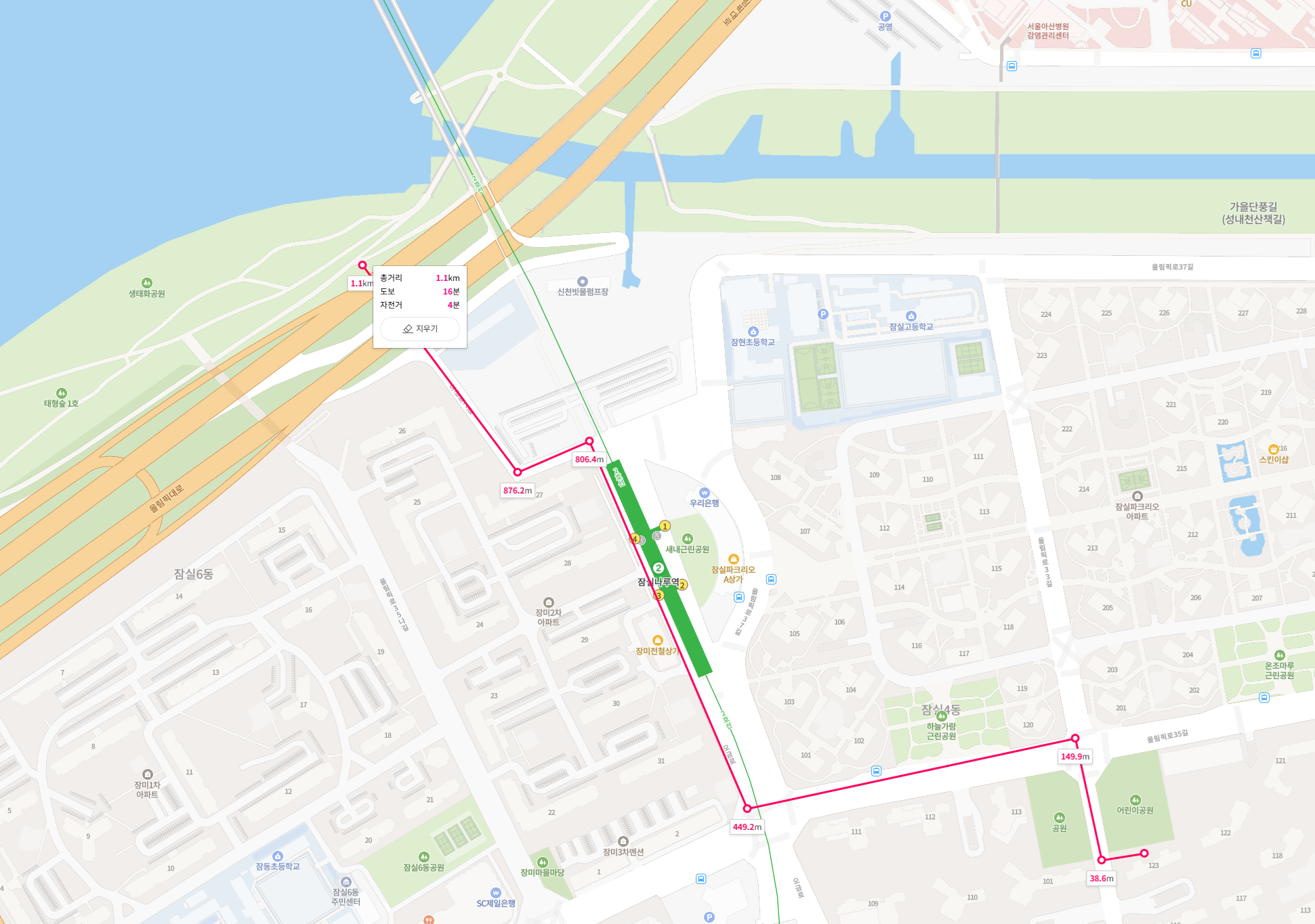 123동에서 한강은 약 1km 만 가면 도착할 수 있는 거리로 잠실나루역을 통한 루트가 가장 빠르고 편합니다.